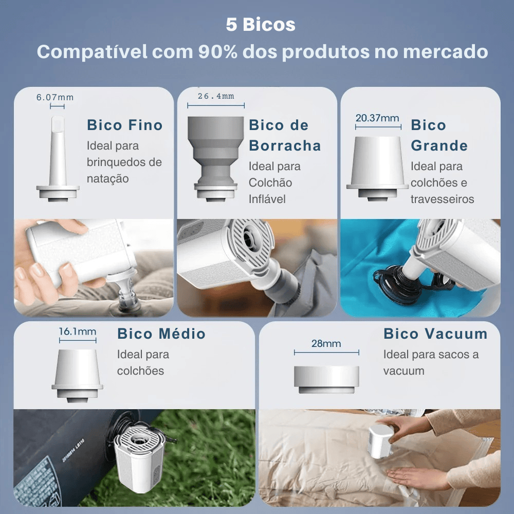 🌬️ Alta eficiência: infla colchões, boias, sacos de dormir e almofadas em poucos minutos